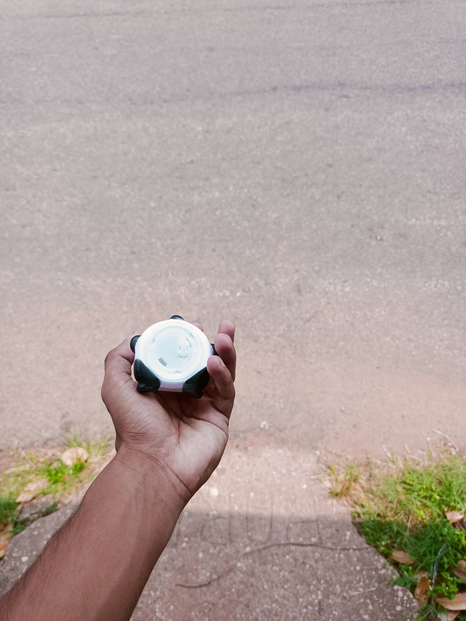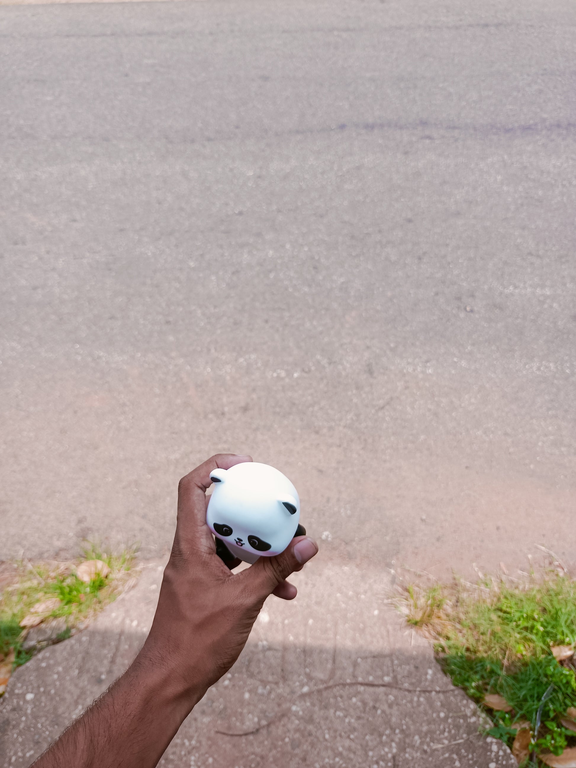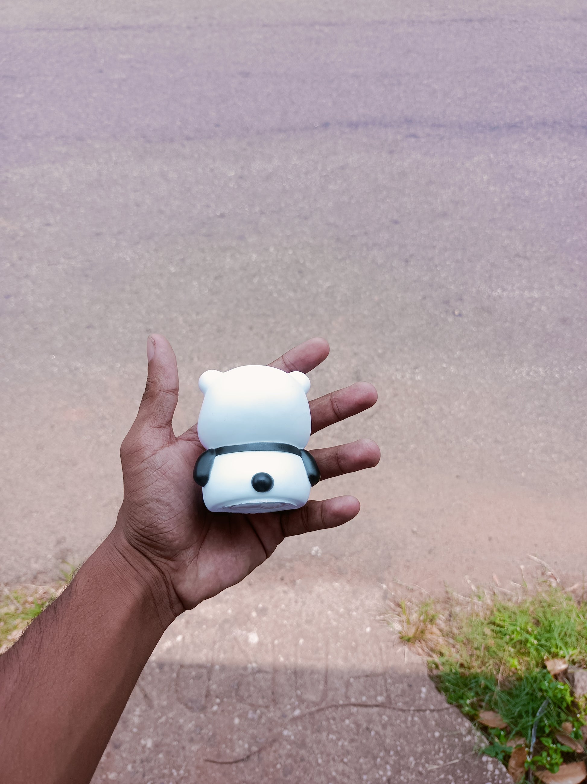 Visuals: The colors are natural and realistic. The background is a soft-focus (bokeh) view of textured pavement with a slight lavender-grey tint, which makes the panda and the hand holding it poAtmosphere: A high-contrast, "low-key" shot set against a pitch-black background.